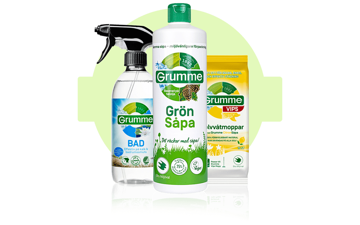 Grumme såpa är en städklassiker sedan 1882. Vi har valt att ha Grumme i vårt sortiment med fokus på städning, disk och rengöring. Förutom såpa och andra rengöringsmedel hittar du även miljömärkta och komposterbara städservetter, golvvåtmoppar och städsprayer i sortimentet.